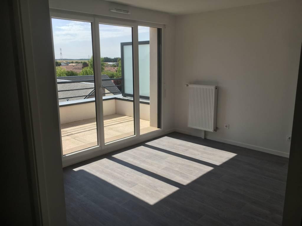 Appartement T2 récent de 43,90 m² situé au troisième étage comprenant une entrée avec placard, un salon/séjour avec cuisine ouverte et semi-équipée (plaques, hotte) donnant sur une terrasse, une chambre avec placard, une salle d'eau et un wc.